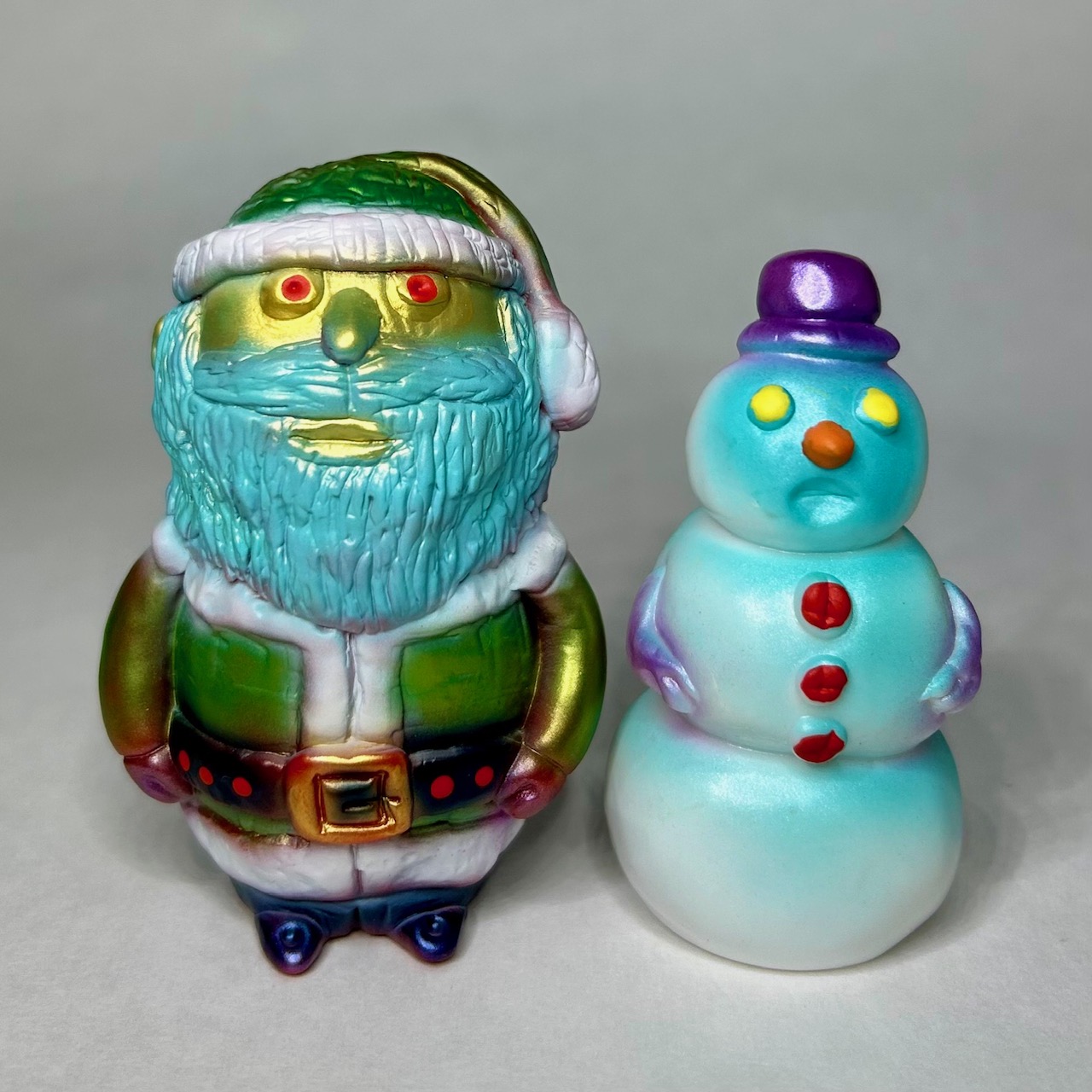 Santa and Snowman! The Snow Buddies! Soft vinyl finger puppets painted by me to mimic toys from the 1950s. They stand around 2-2.5 inches.